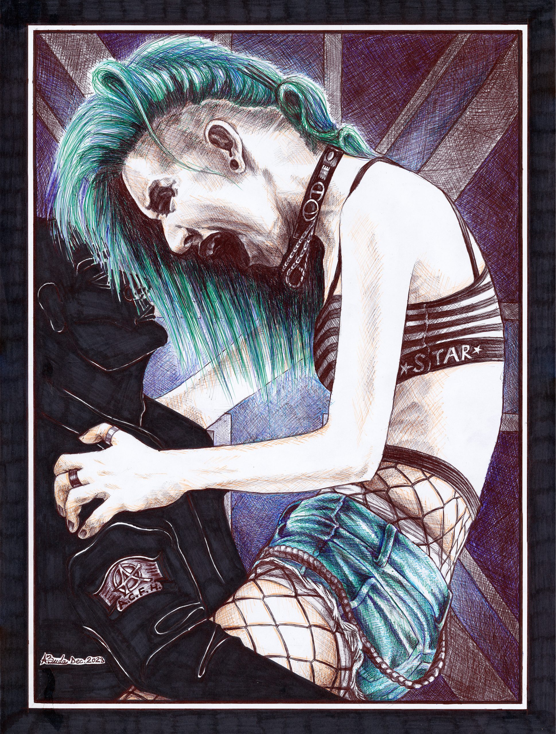 Compoziţie A2 (48×63,5 cm), pix negru, albastru închis, albastru deschis, verde închis, portocaliu; permanent marker negru