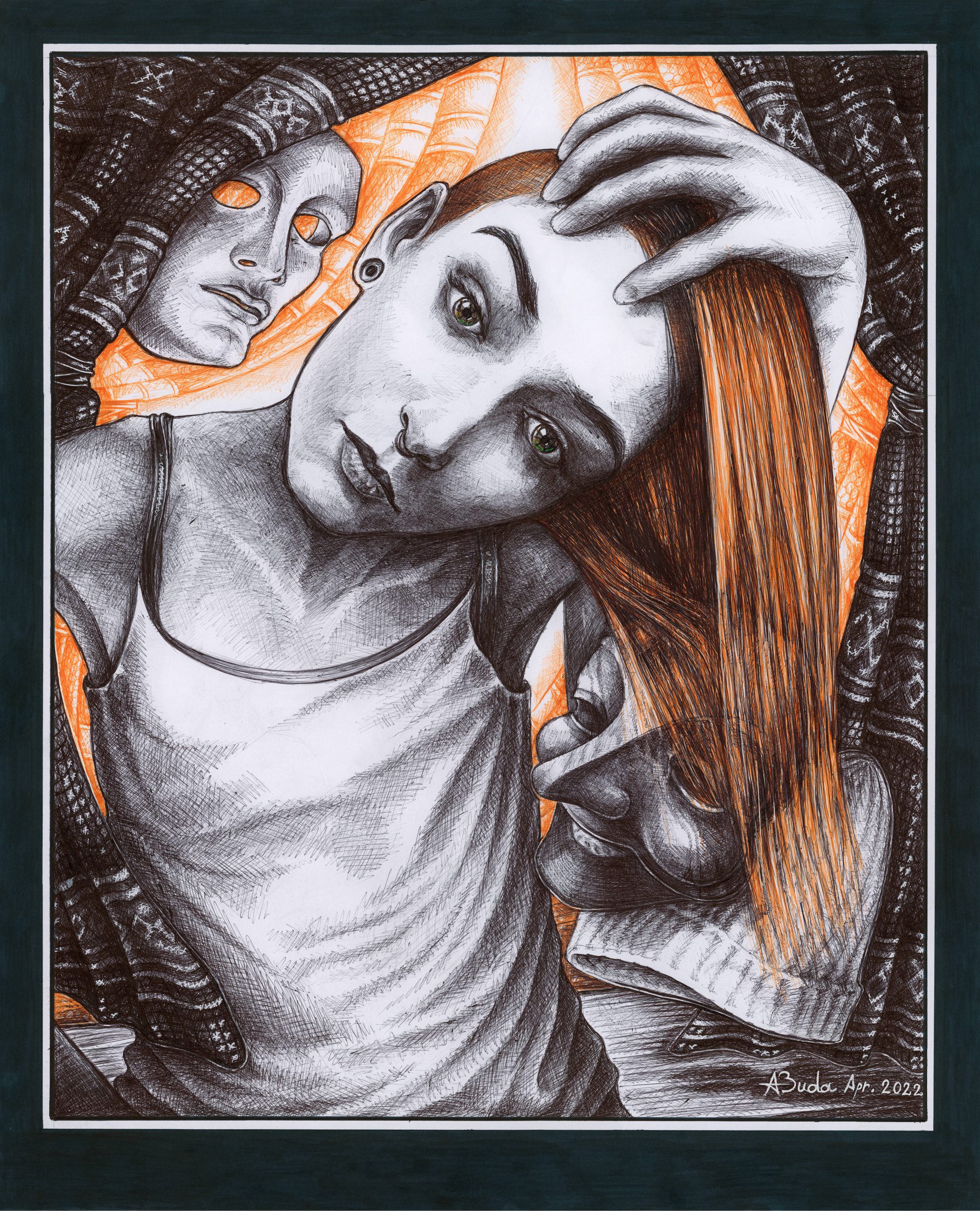 Faces “Faces” Data: aprilie 2022 Compoziţie A2/A1 (51×63 cm), pix negru, alb, portocaliu și verde; permanent marker negru