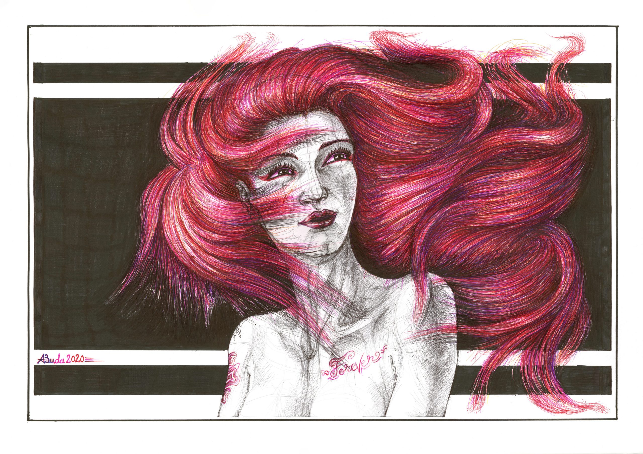 “Headbang 1” Compoziţie A1 (59×84 cm), pix negru, violet, roșu și roz; permanent marker negru “Headbang 1” Compoziţie A1 (59×84 cm), pix negru, violet, roșu și roz; permanent marker negru