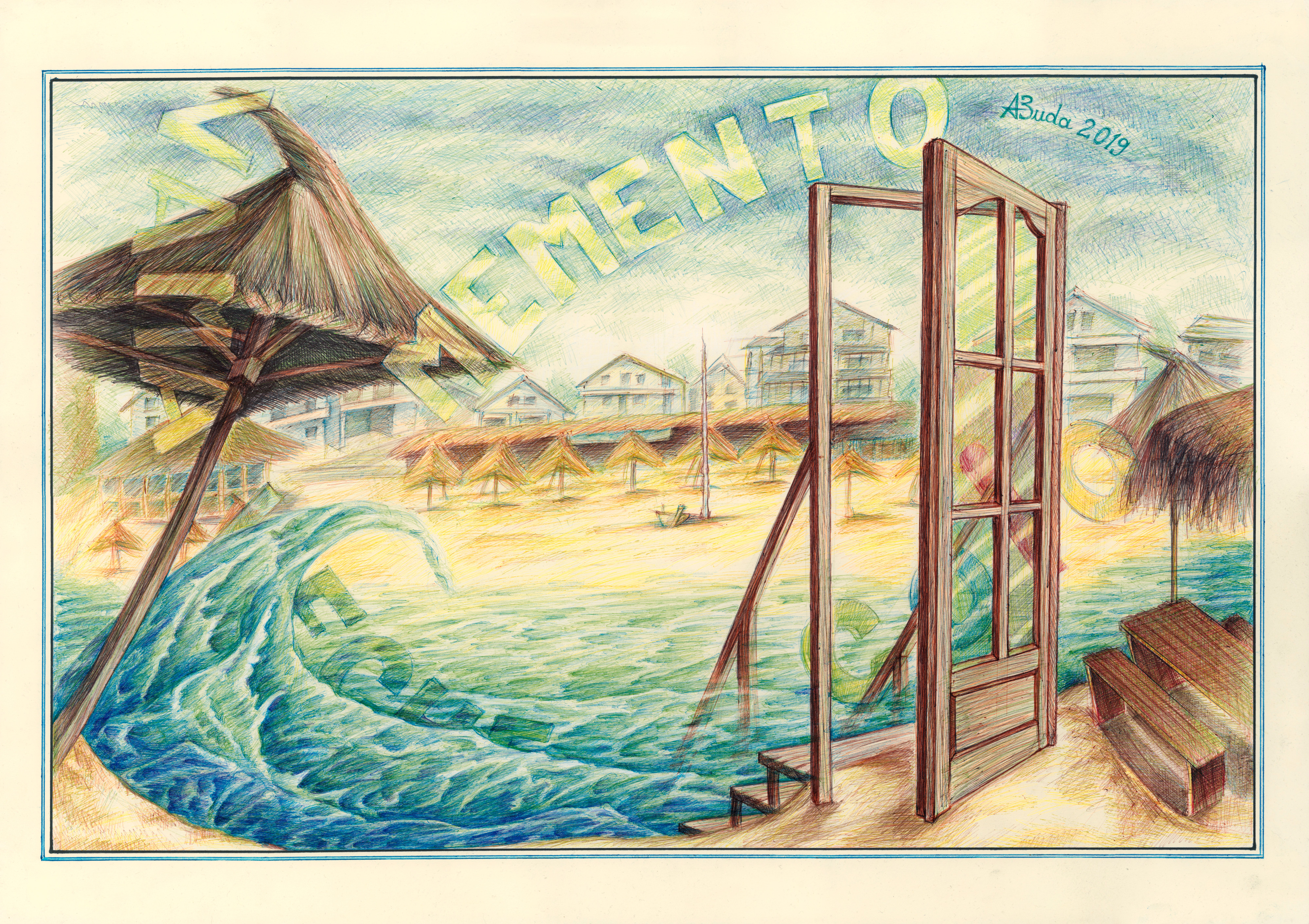 Compoziţie A1 (80×56 cm), pixuri colorate: negru, albastru închis – deschis, verde, galben închis – deschis, portocaliu, siena închis – deschis