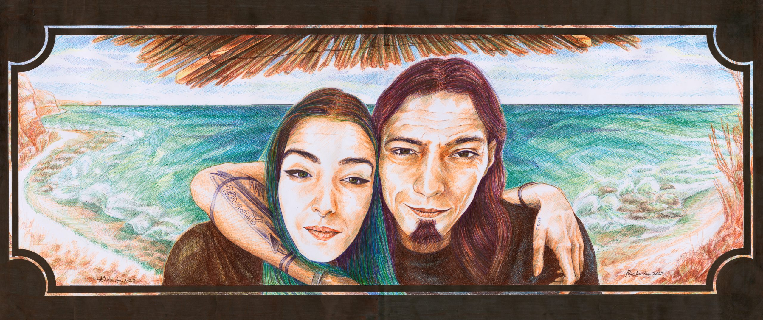 Compoziţie A1 (126×51 cm) (două piese), pix negru, albastru închis, albastru deschis, verde închis, verde deschis, galben, portocaliu, roșu și maro; permanent marker negru