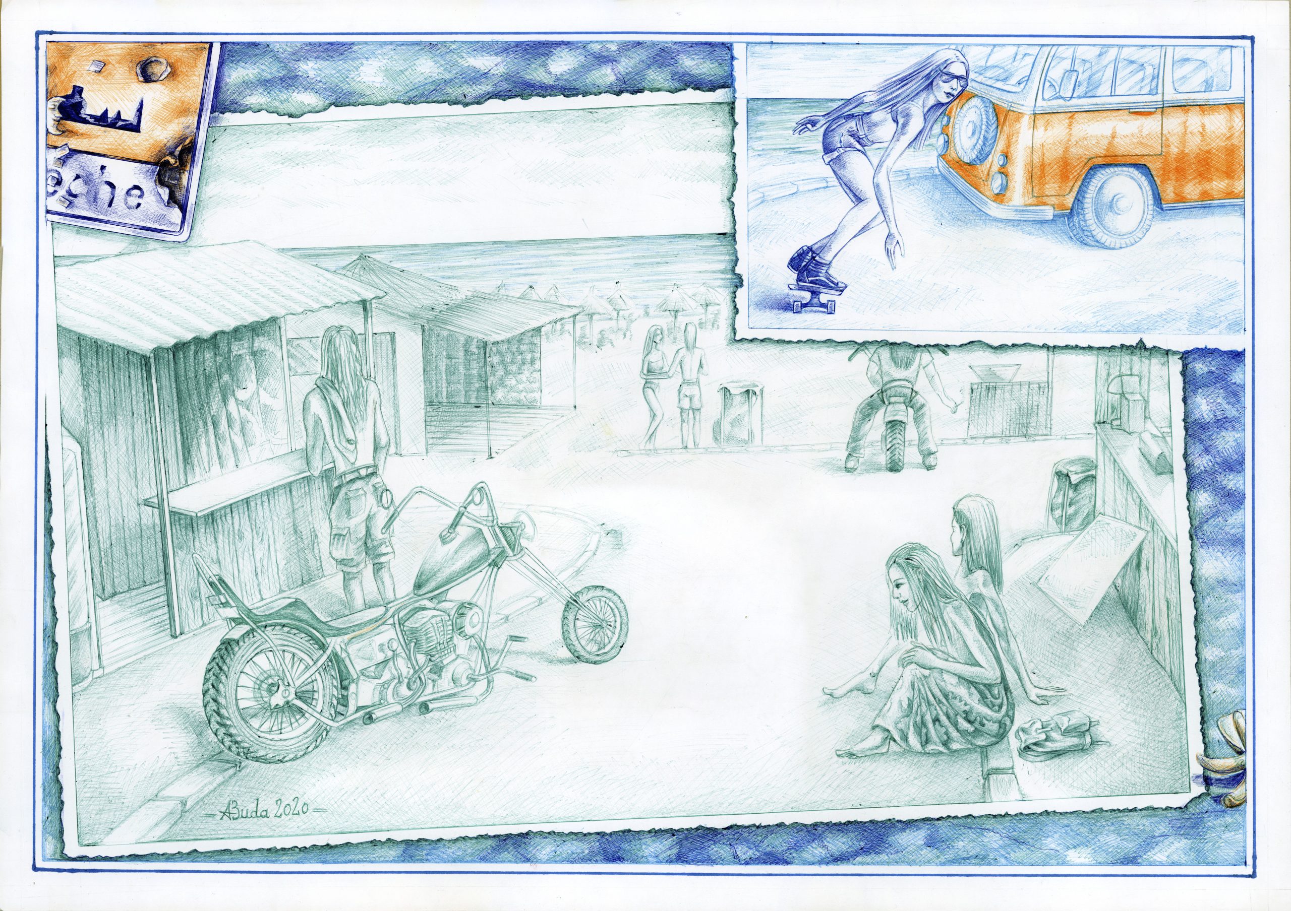 “Summer 2” Compoziţie A1 (84×59 cm), pix portocaliu, verde, albastru deschis și albastru închis; permanent marker albastru “Summer 2” Compoziţie A1 (84×59 cm), pix portocaliu, verde, albastru deschis și albastru închis; permanent marker albastru