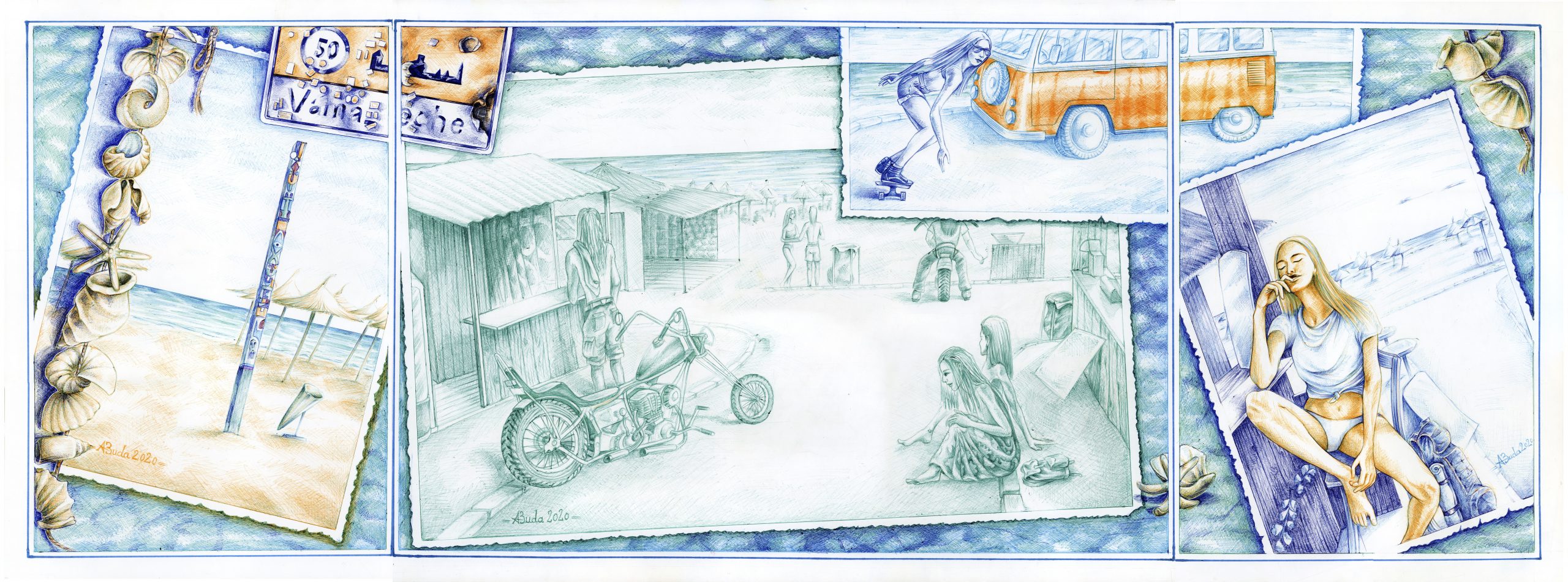 “Summer” Compoziţie A0 (168×59 cm), pix portocaliu, verde, albastru deschis și albastru închis; permanent marker albastru “Summer” Compoziţie A0 (168×59 cm), pix portocaliu, verde, albastru deschis și albastru închis; permanent marker albastru