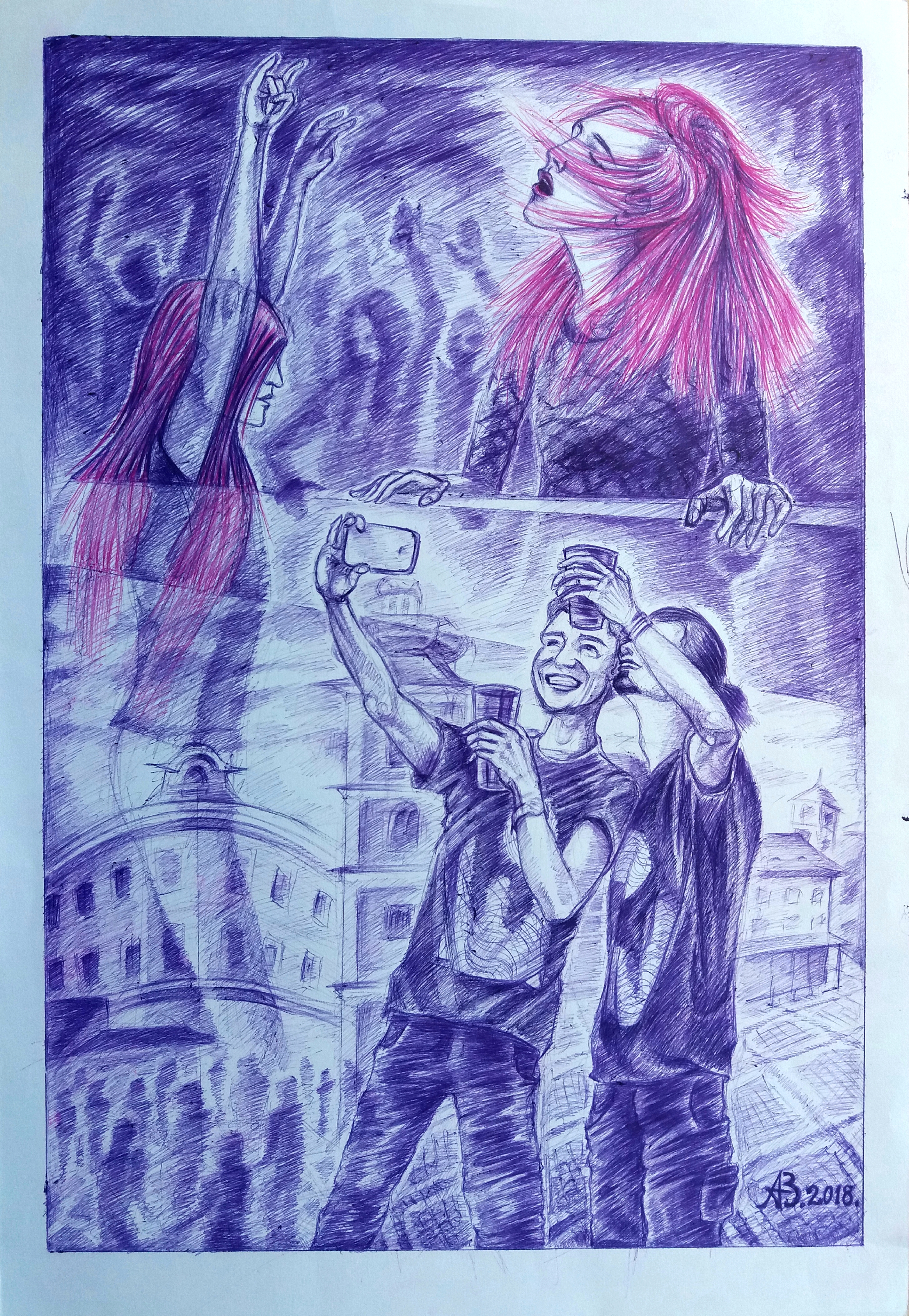“Young Vibe 3/3” Compoziţie A2 (38×55 cm), pix violet şi roz “Young Vibe 3/3”Compoziţie A2 (38×55 cm), pix violet şi roz
